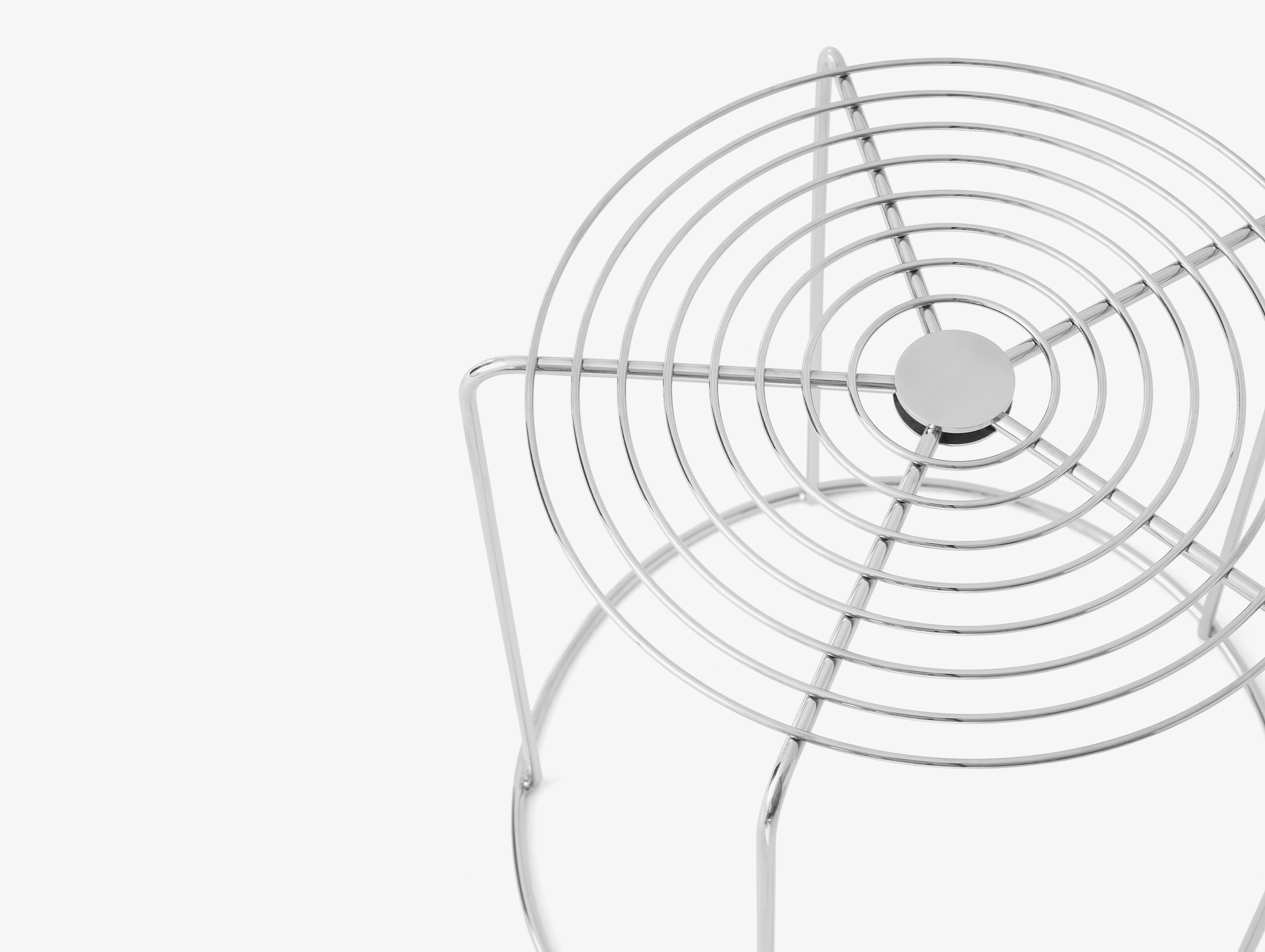 The stool is made from a stainless steel wire frame, precisely bent into circular forms and spot welded for stability with a mirror polished finish. A magnetic steel centre plate allows easy attachment of the seat pad.