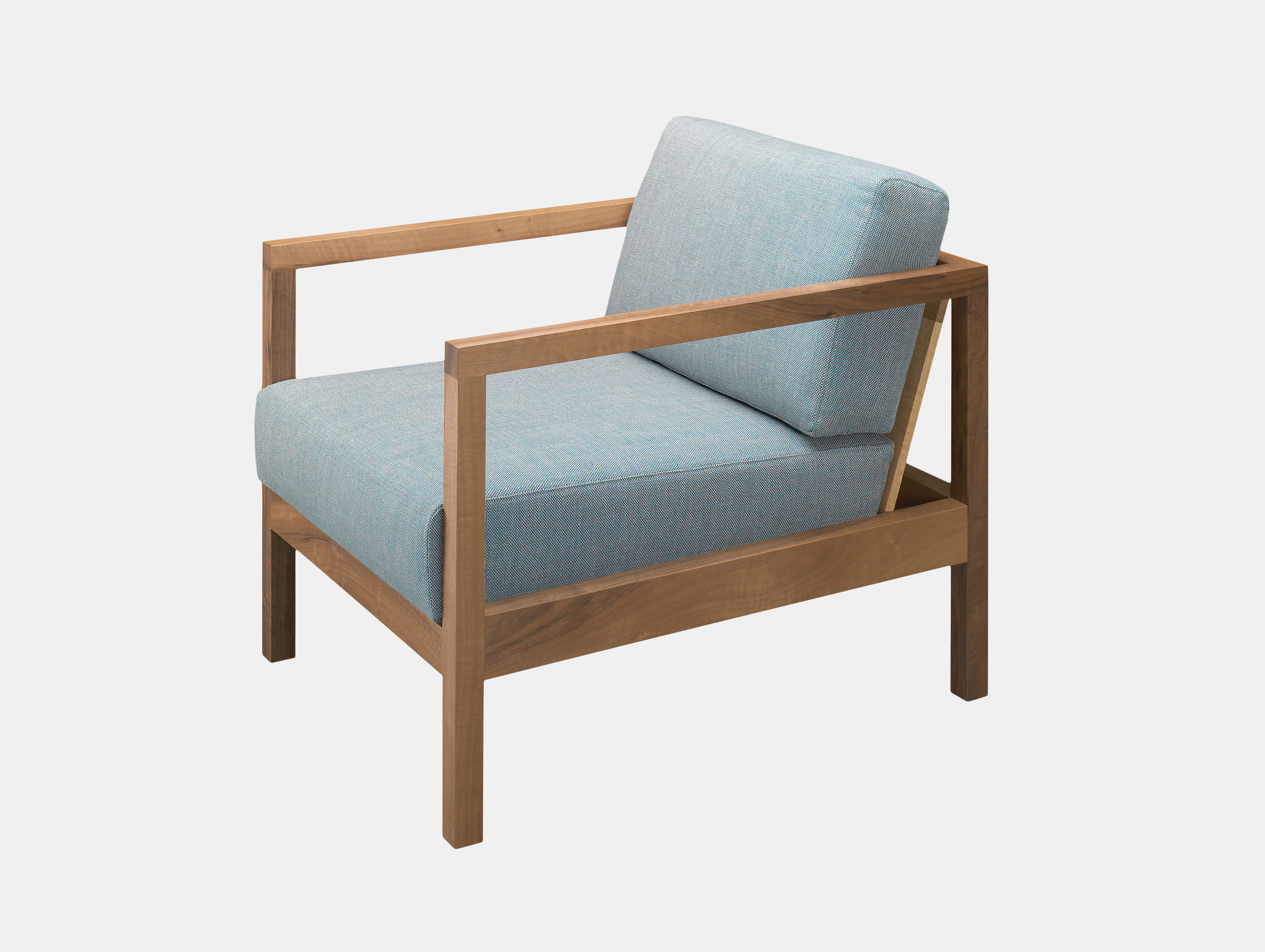 Offered in European Oak or Walnut, this low chair features a gently slanted slatted back and generous open armrests.