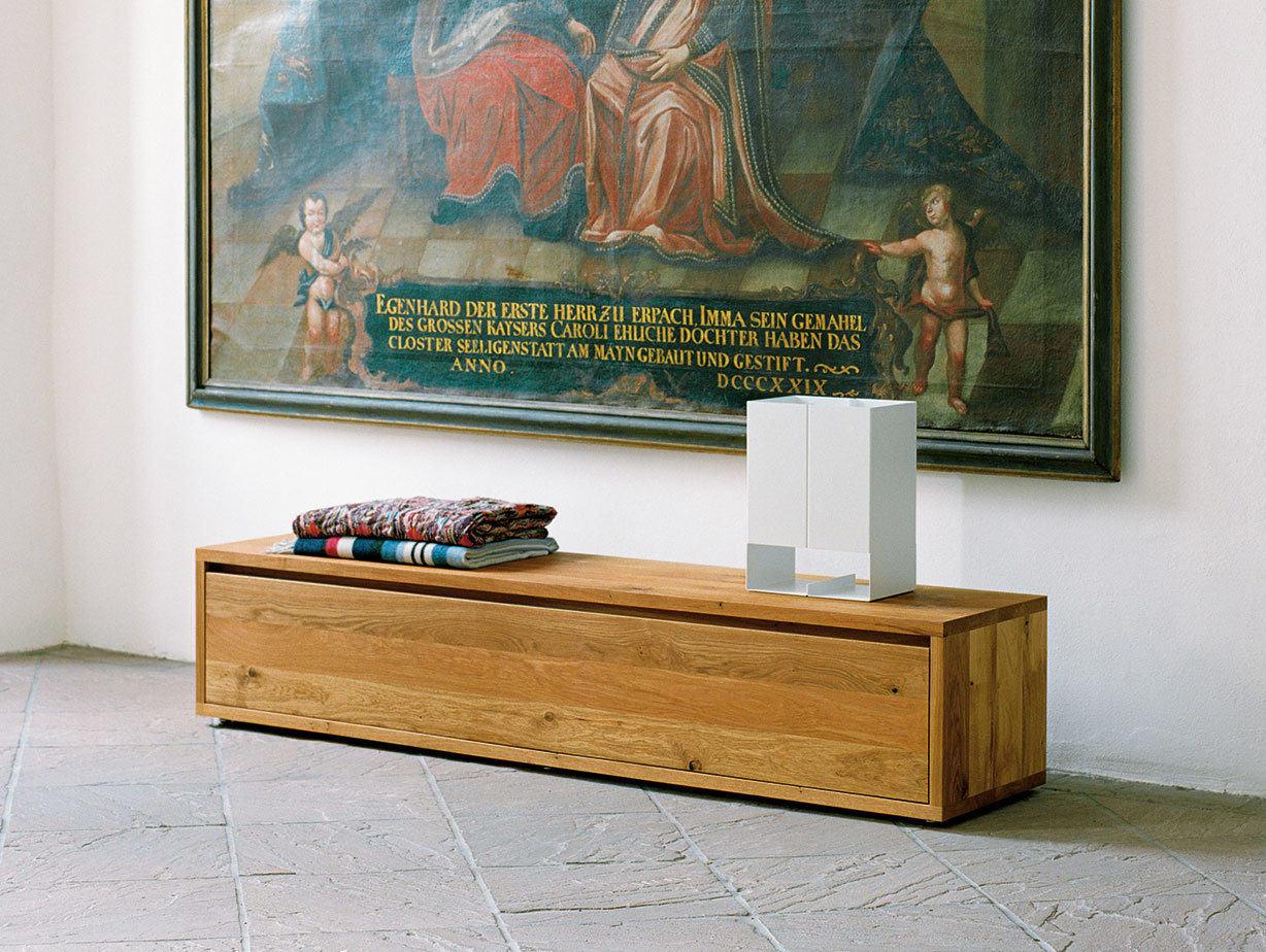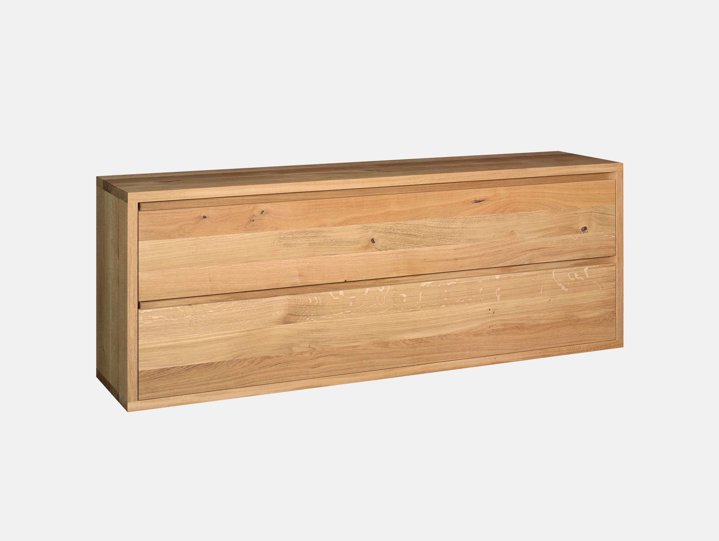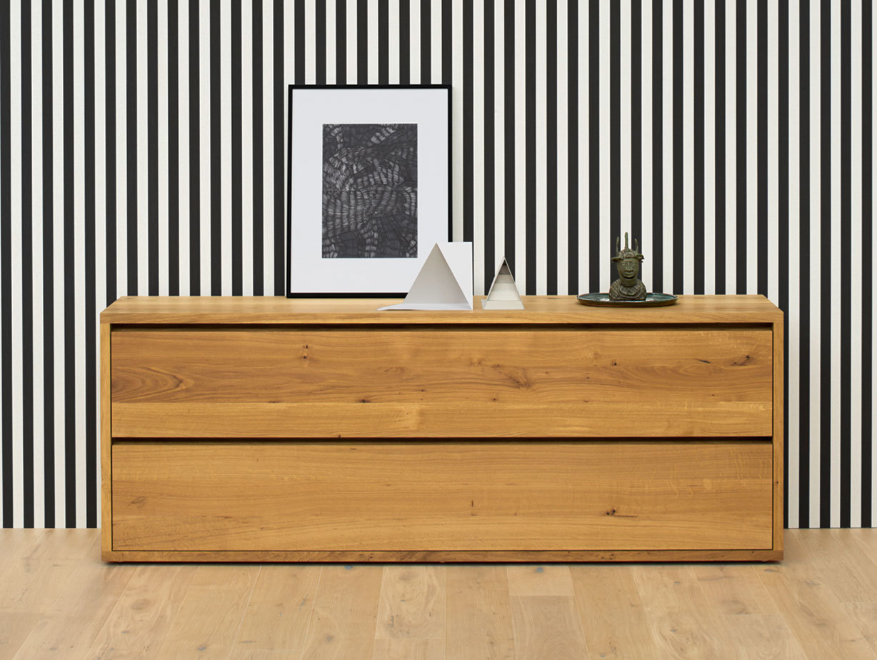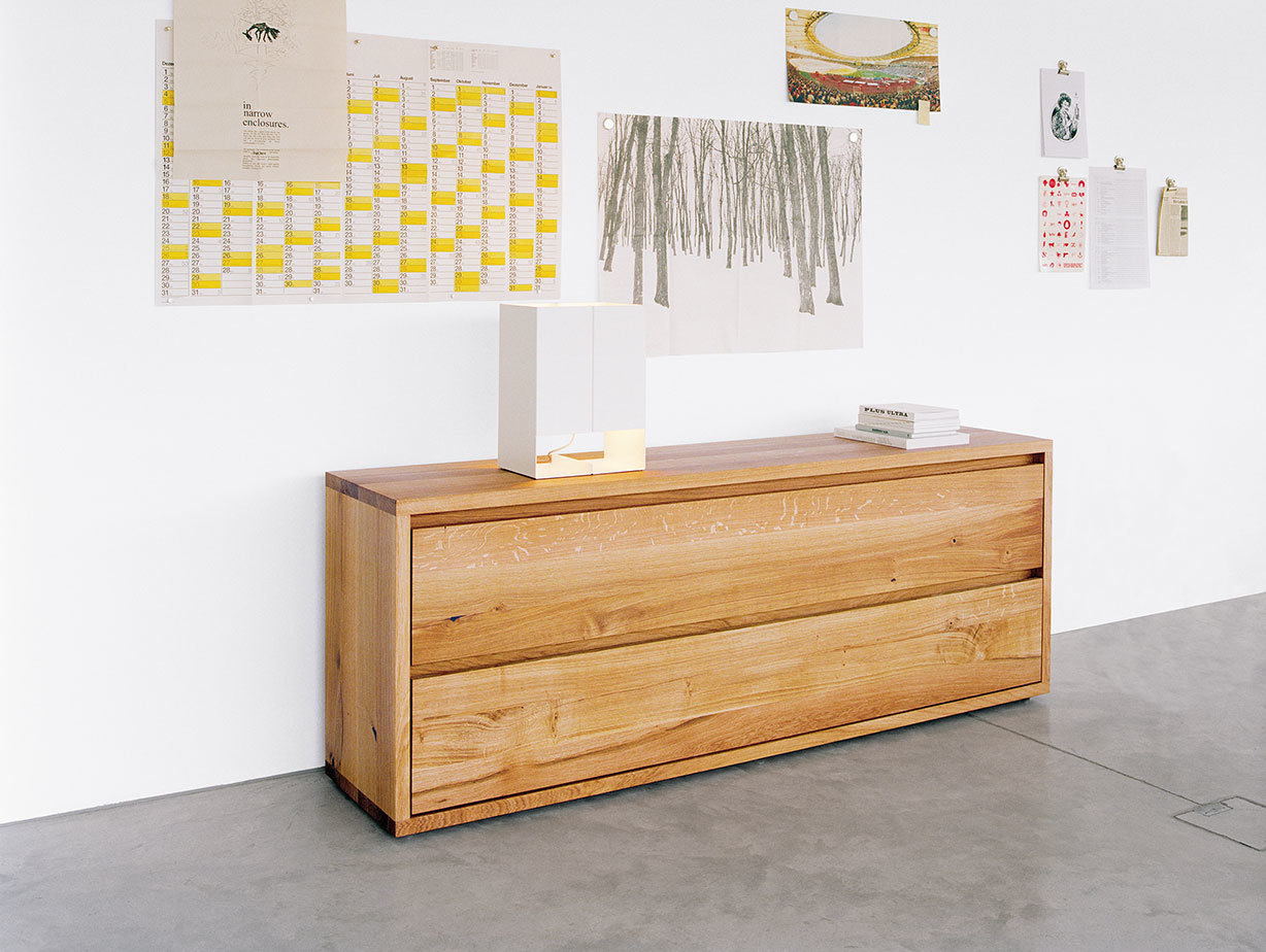 Characteristic solid wood brings a unique grain to each piece, while its knots and rings become a defining feature. Crafted with a clear and simple silhouette, the Imari is a timeless piece that provides a spacious storage solution. The body is made from wood measuring 3cm thick and can be configured with either one or two drawers, which can be opened using the end-to-end slot.