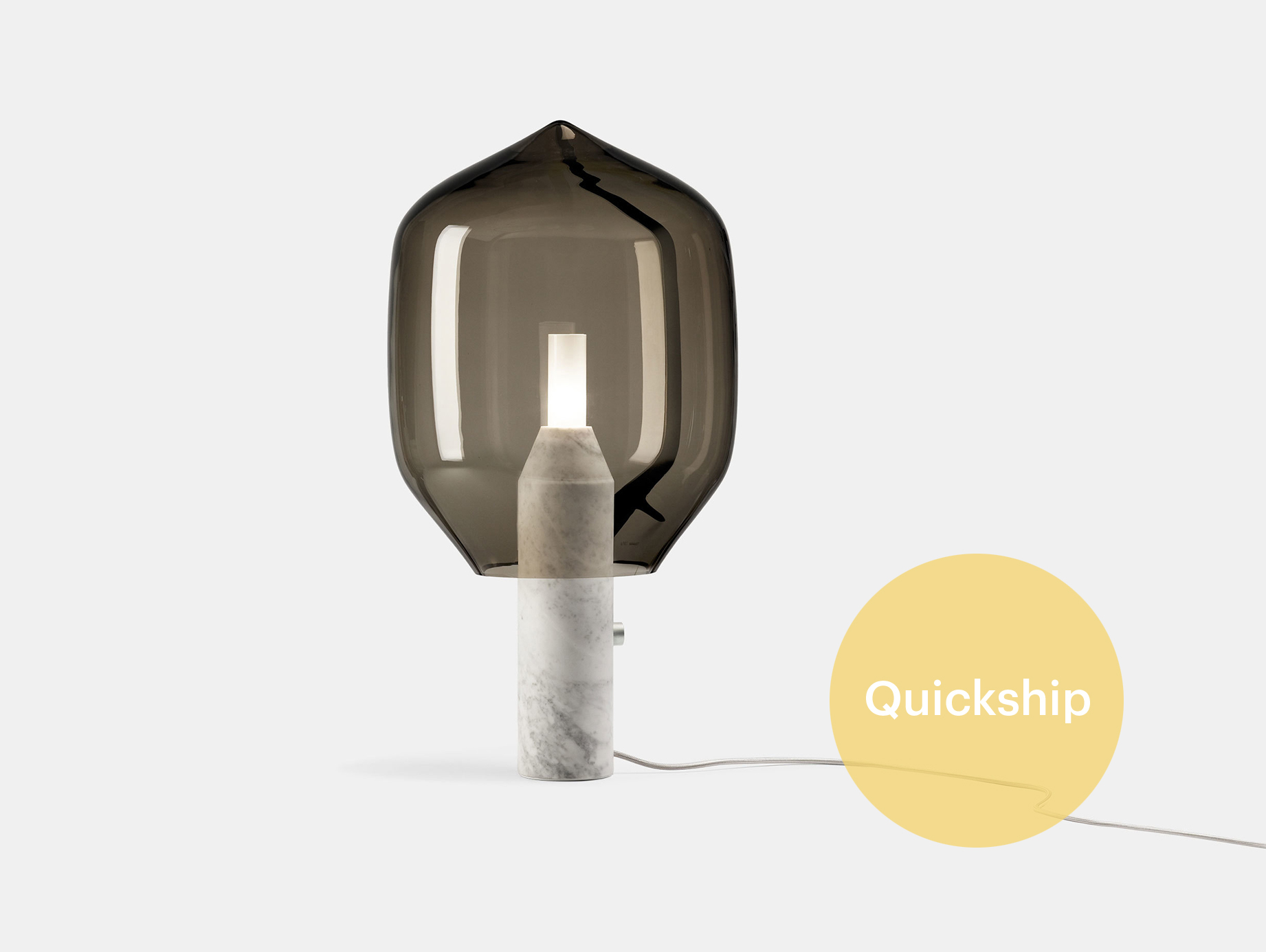 The effect is reminiscent of glass hung from the blower's pipe, taking the material back to its originate form. Contrasting the softness of the shade is the robust marble base, available in either classic white or black.