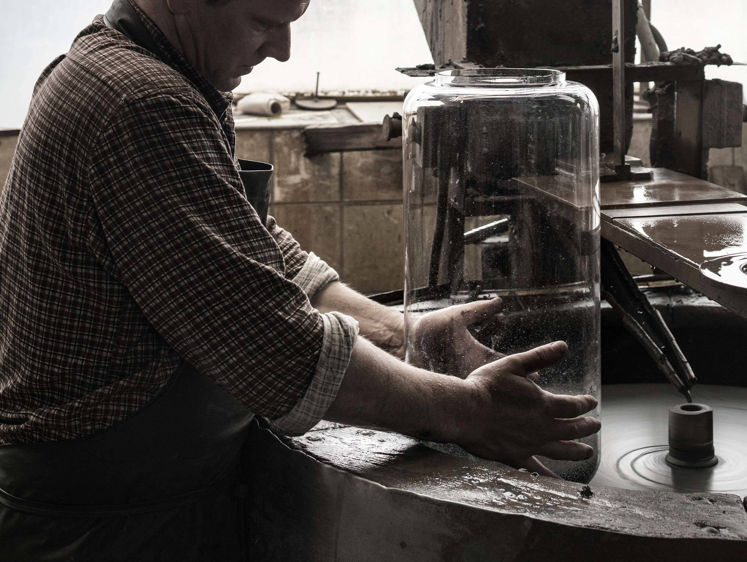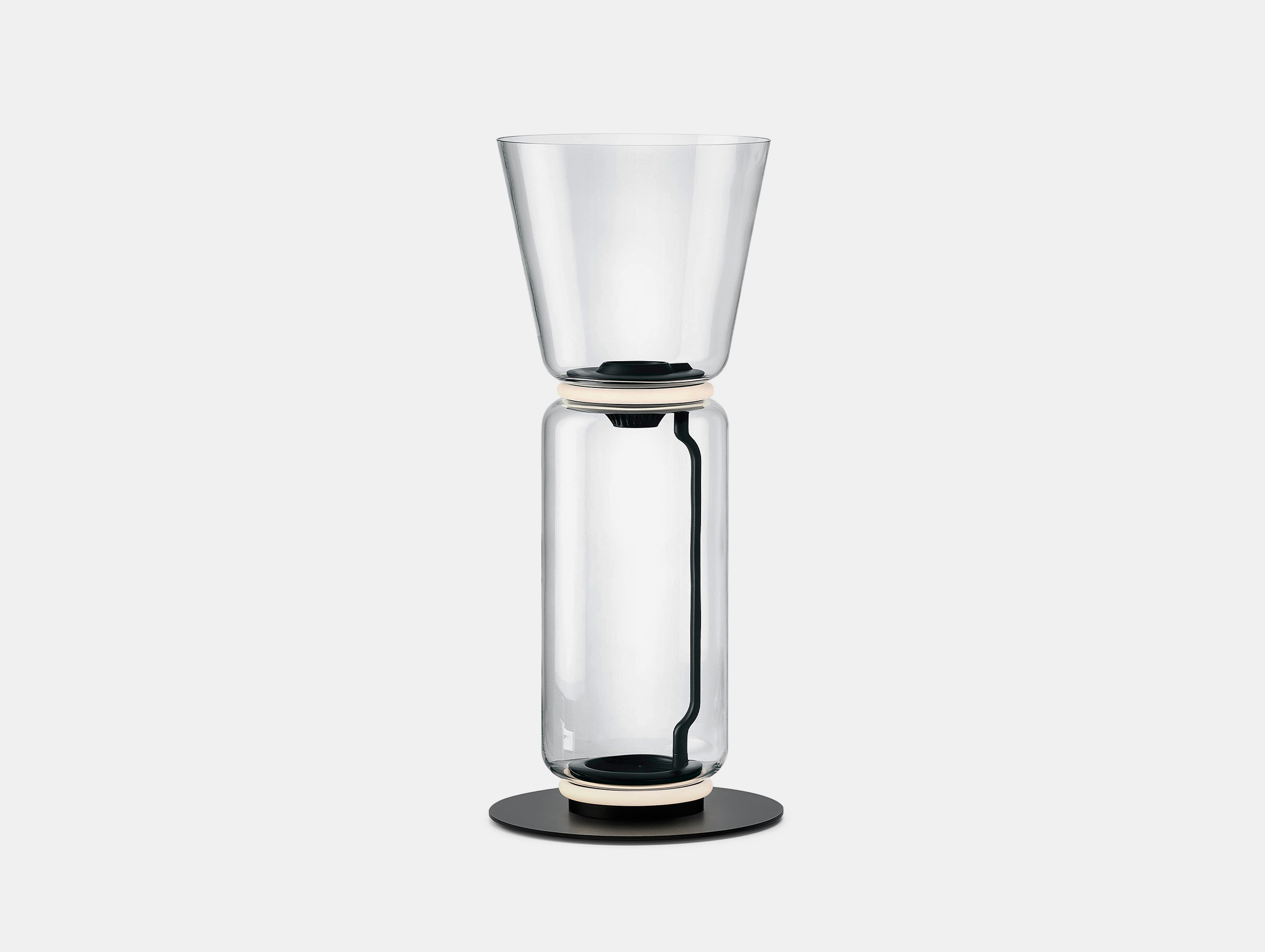 The cylindrical glass modules set the basic grammar of the collection. The single module is a lantern. Several modules stacked on top of each other create a light column, or suspended chandelier inside a stairwell. Extra elements such as a glass dome or cone-shaped head allow for added performance such as a floor-standing uplighter, pendant or table light.
