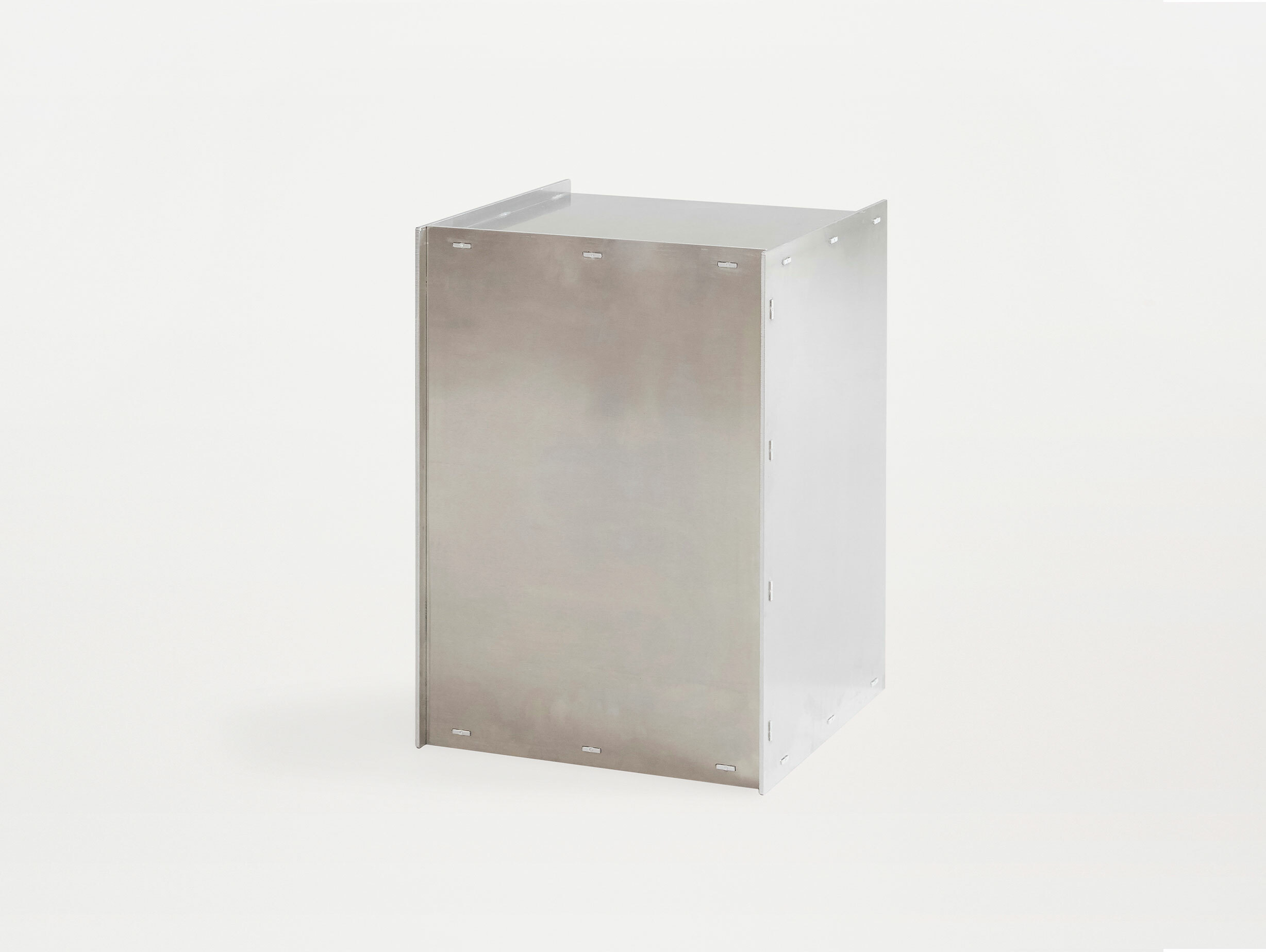 Hand-assembled from laser-cut raw aluminium sheets using a distinctive cold-forming riveting technique, the Rivet Box Table is both sturdy and versatile. It can be positioned vertically or horizontally, functioning as a side table, storage unit, or display pedestal—or as a multifunctional piece that adapts to your space.