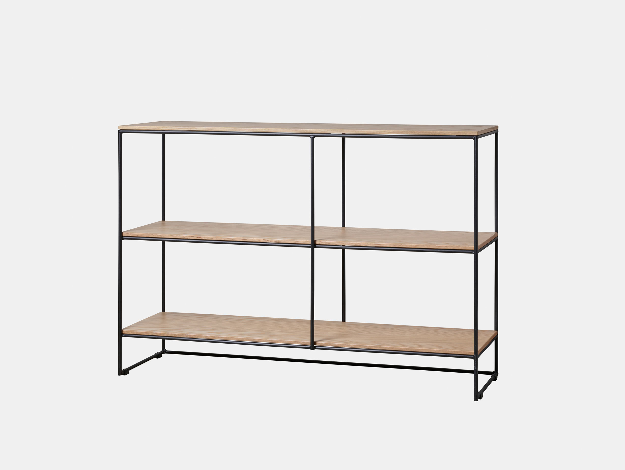Powder-coated steel rods connect natural oak shelves in three sizes and configurations. With a keen attention to detail, its corners have been welded by hand and rounded to give a softer aesthetic, while its wooden edges are bevelled to fit seamlessly into the frame.
