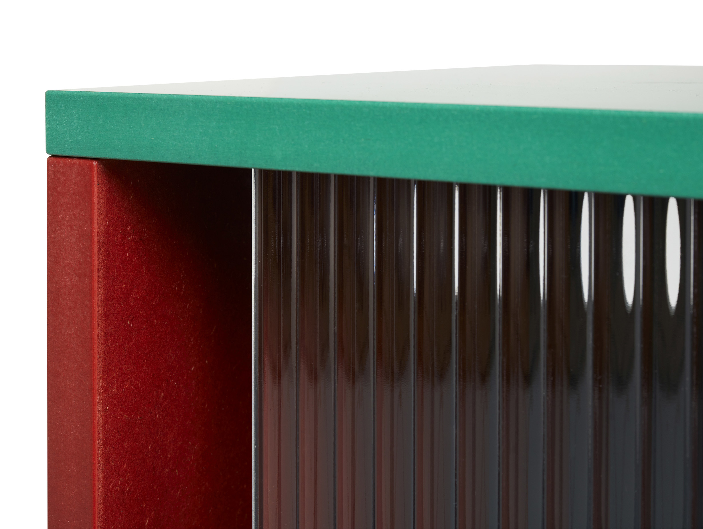 The panels of the Colour Cabinet are crafted from a UV lacquered Valchromat - a type of robust MDF material. Organically dyed, it displays visible wood fibres that add to its character. The supporting frame of the cabinet is made from durable, powder-coated steel and features sliding glass doors in tempered reeded clear glass.