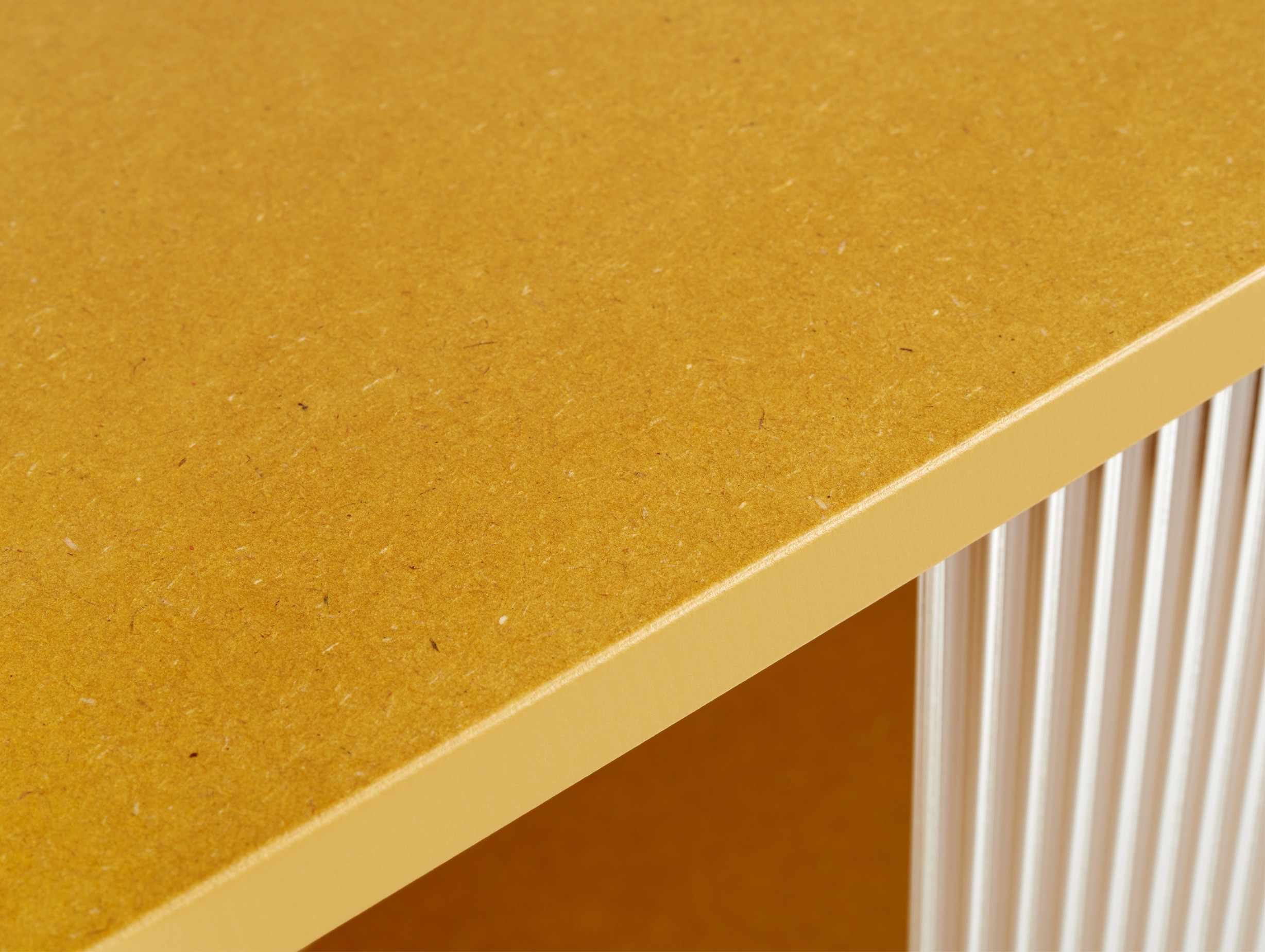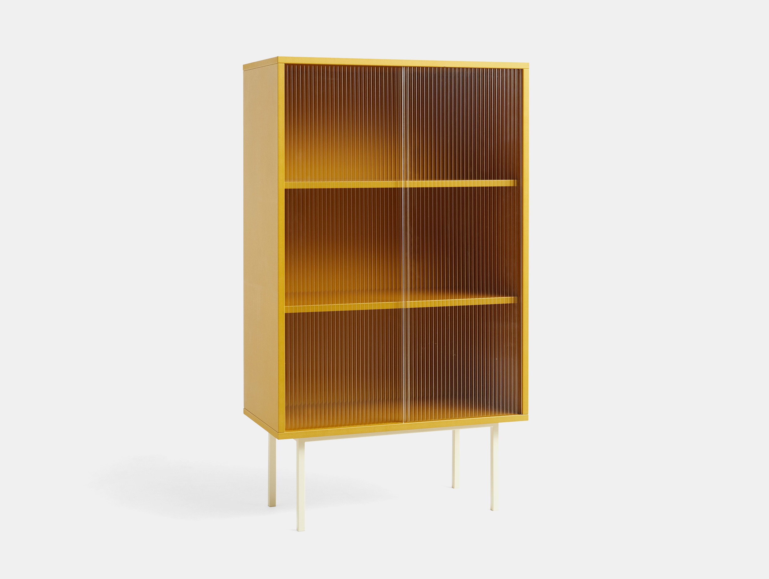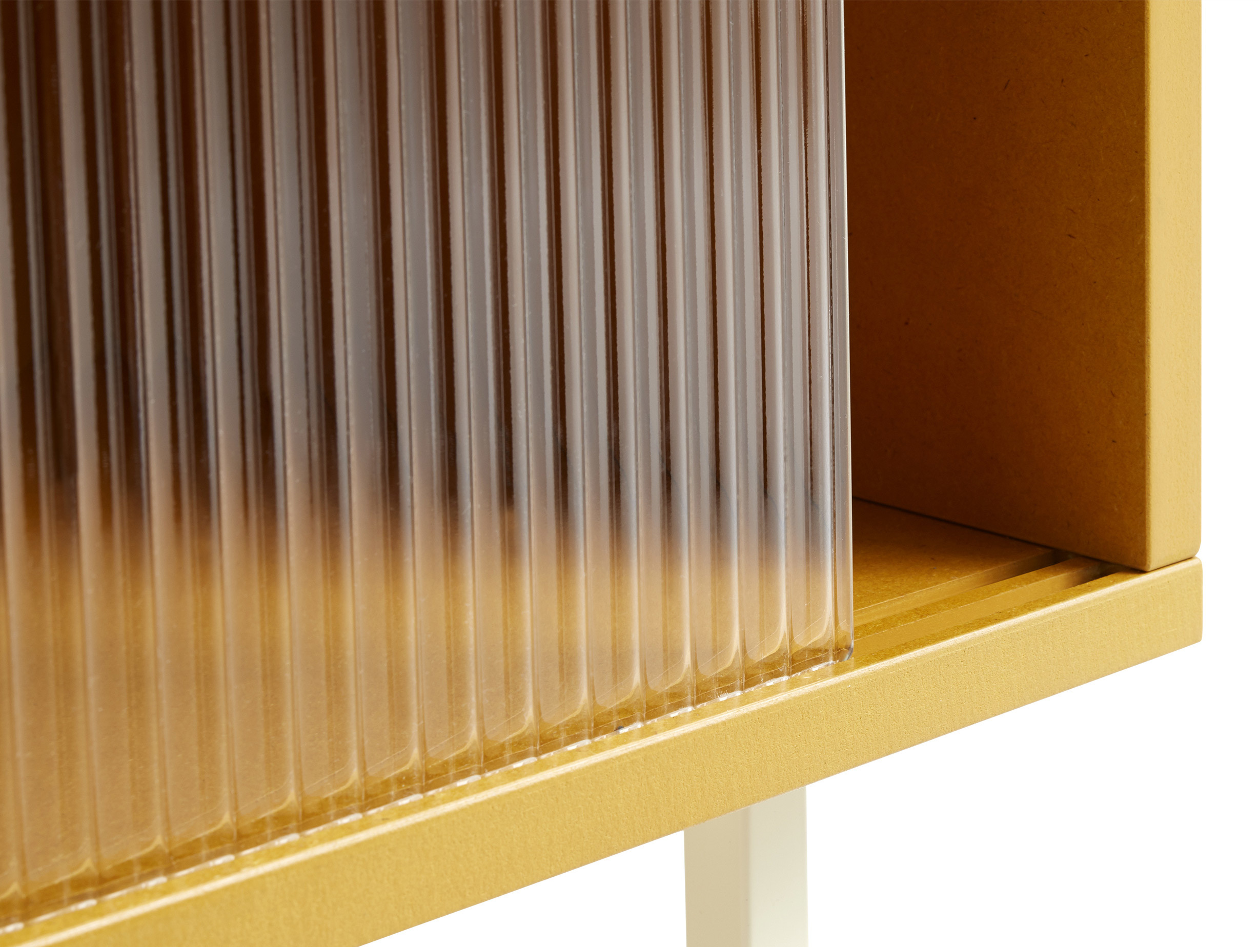 The panels of the Colour Cabinet are crafted from a UV lacquered Valchromat - a type of robust MDF material. Organically dyed, it displays visible wood fibres that add to its character. The supporting frame of the cabinet is made from durable, powder-coated steel and features sliding glass doors in tempered reeded clear glass.