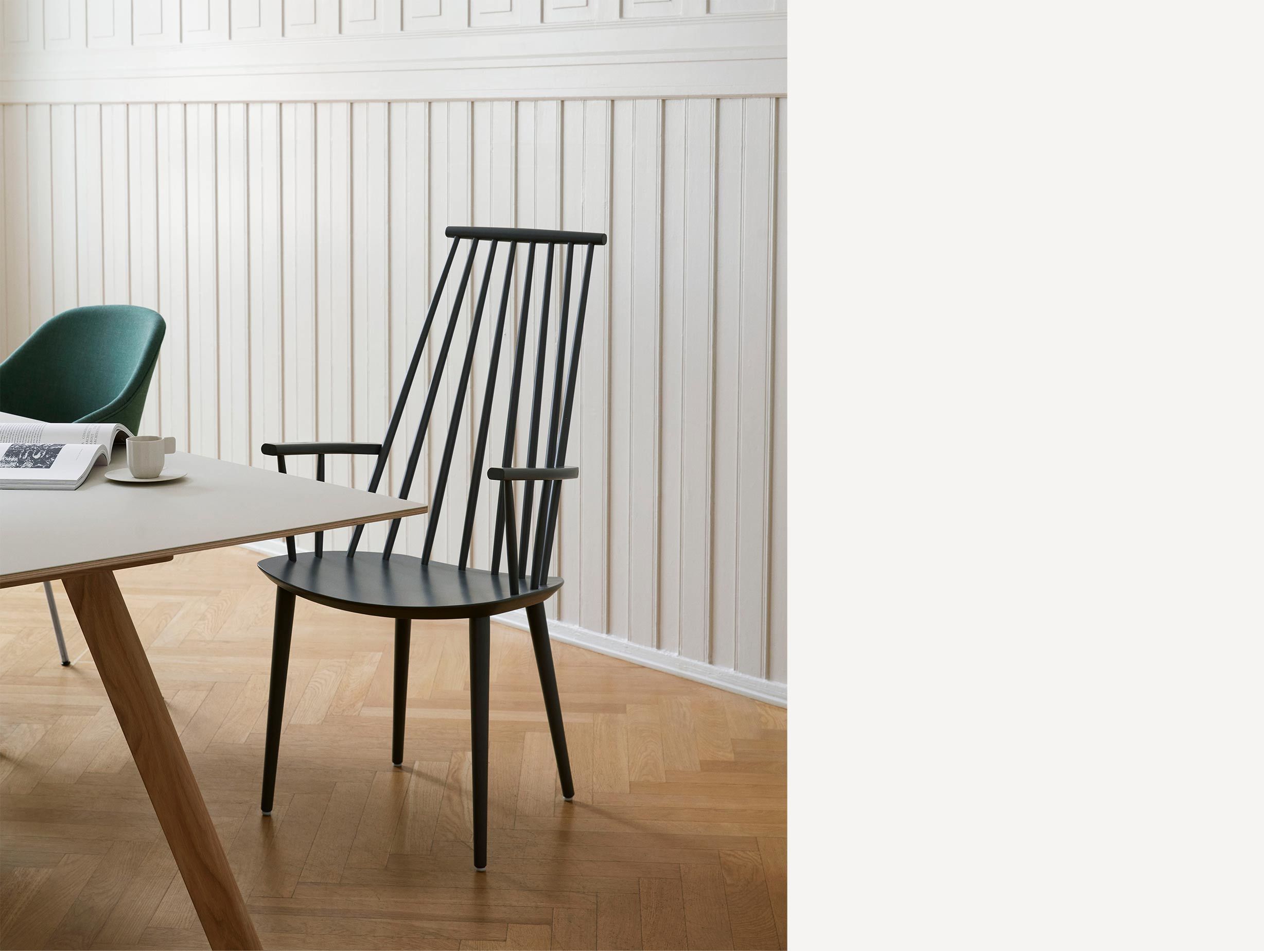Today the chair retains a timeless aesthetic, with slender wooden rods and gently curved armrests providing a comfortable seat for everyday use. Made of lacquered solid beech wood. The J110 chair is available with a natural finish or a selection of colours; jade-green, sage, slate blue, warm grey, white, black, lacquered oak and oiled oak.