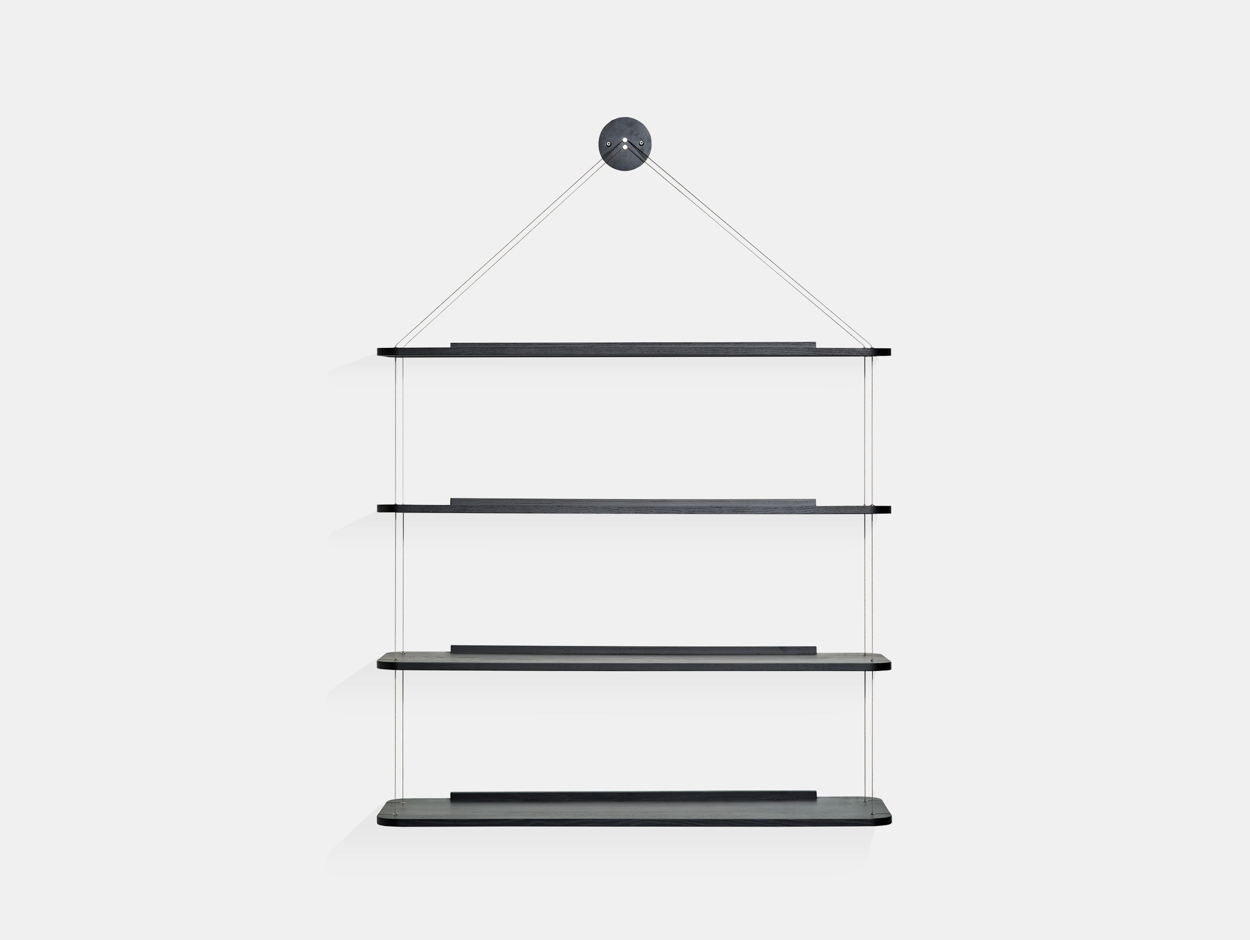The 1966 version consisted of four birch boards, faced with natural phenolic laminate, supported by two slender cables joined at the point of attachment – a satin-finish brass plate anchored to the wall. This has been changed to reflect modern developments in materials and manufacturing techniques so that now the shelves are supplied in either black stained oak or lacquered oak, with black lacquered steel wall mount.
