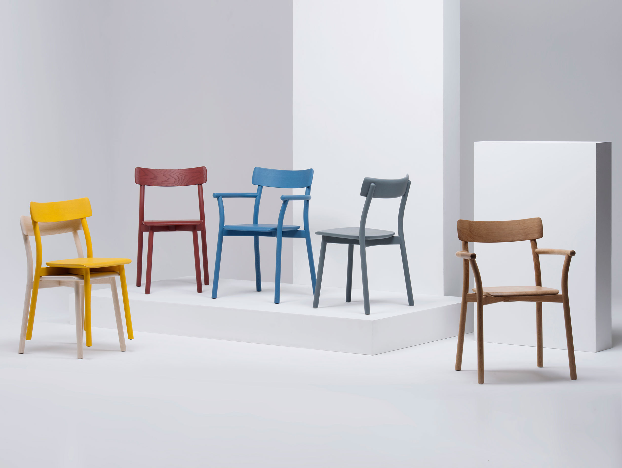Well-formed and highly functional, the Chiaro chair can be purchased as a side or armchair, and can be ordered in a range of natural or coloured finishes.