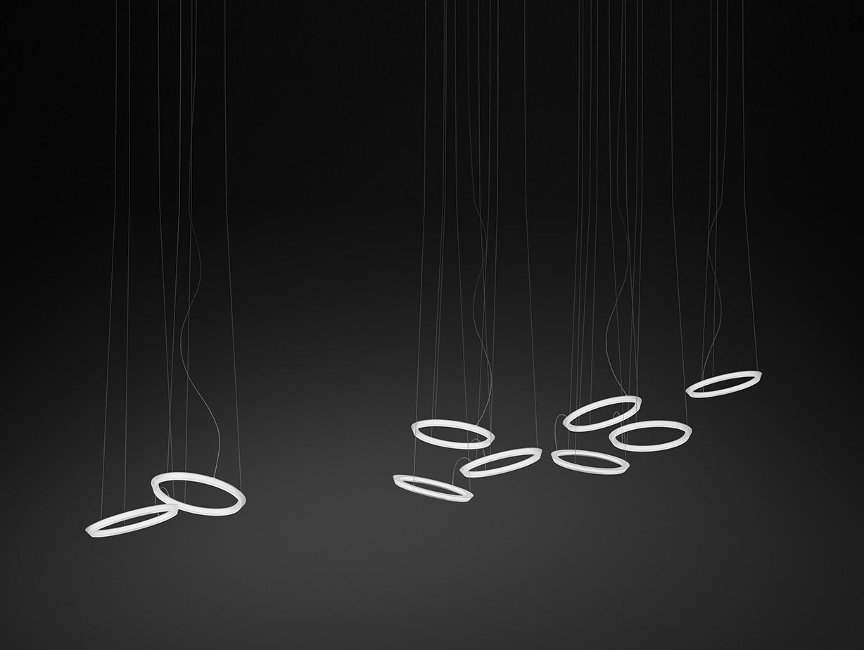 Thoughtful in design and construction, the pendant is made of acrylic diffusers assembled to create a graceful movement of circular lights. Suited to residential and contract spaces, the lights are available in a range of configurations.