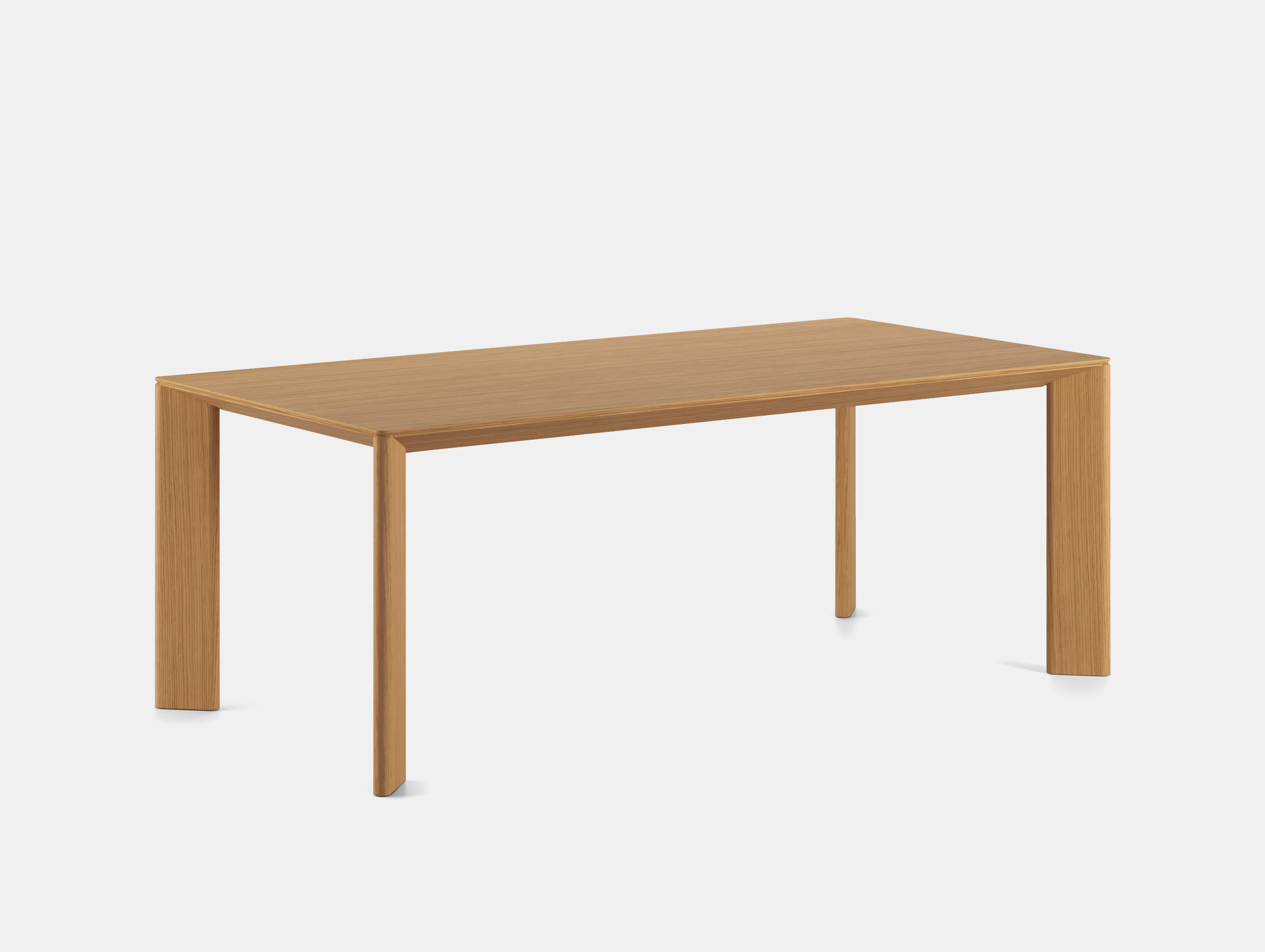 Crafted from solid oak into a refined expression of minimalism, the Foro Table balances warmth, durability, and woodworking expertise. The legs of the table are positioned at 45-degree angles and finished with smooth, rounded edges.