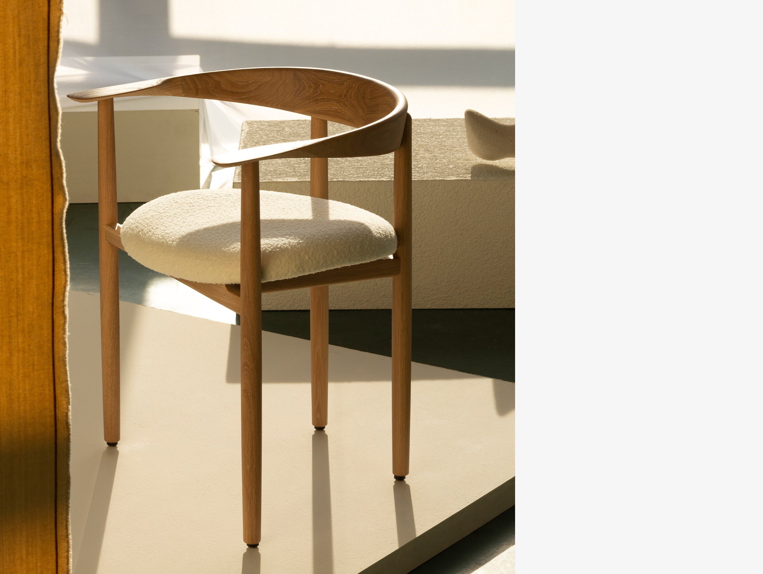 The distinctive crescent backrest of Sava flows into gently curved armrests, creating a fluid silhouette that brings both movement and poise. Striking a balance between refined form and everyday comfort, it is well suited to both residential and contract use.