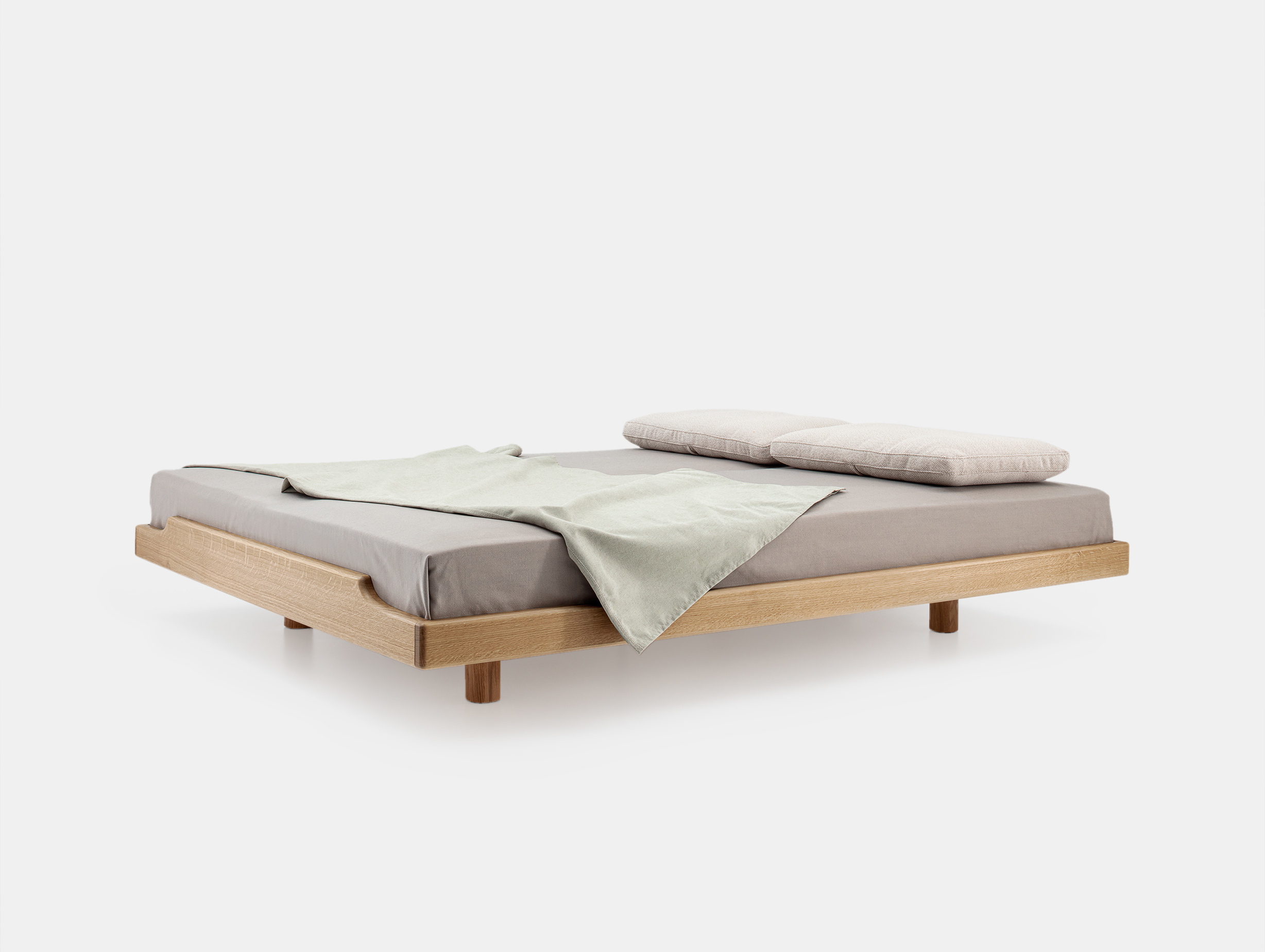 This Zeitraum Petit bed features a minimalist frame in solid White Oiled Ash or American Oiled Walnut that secures the mattress in place with its subtle curved design.